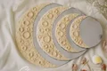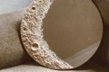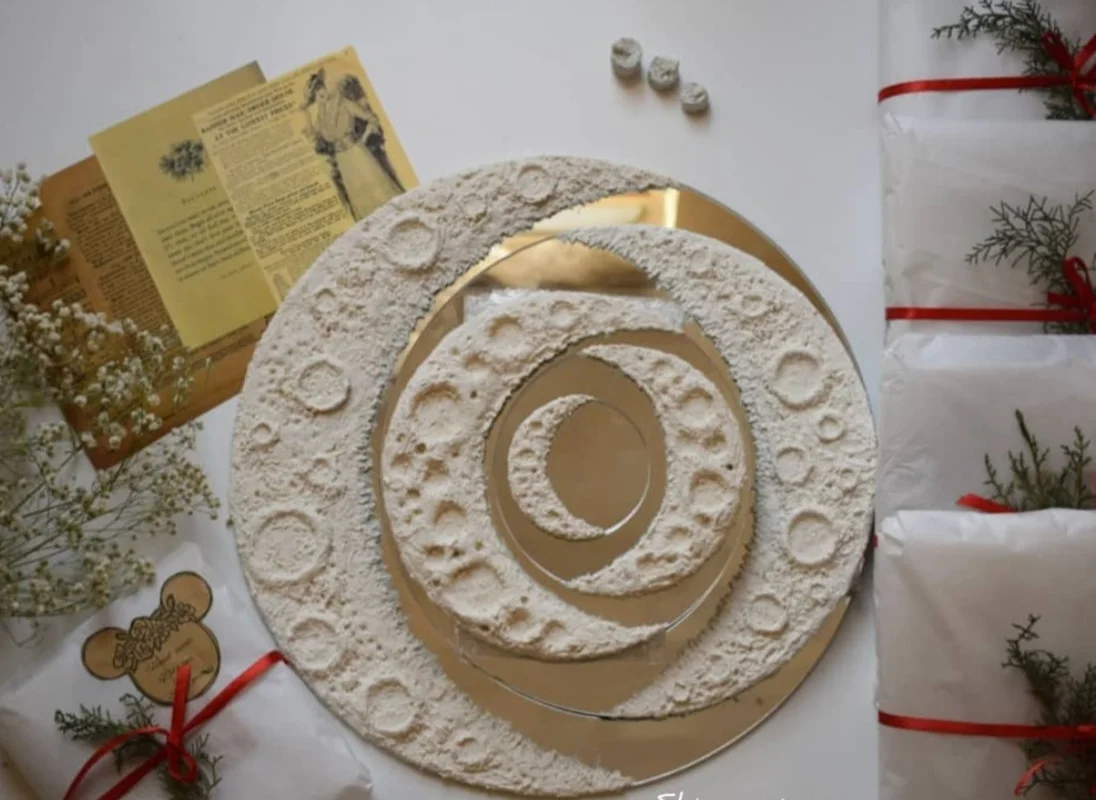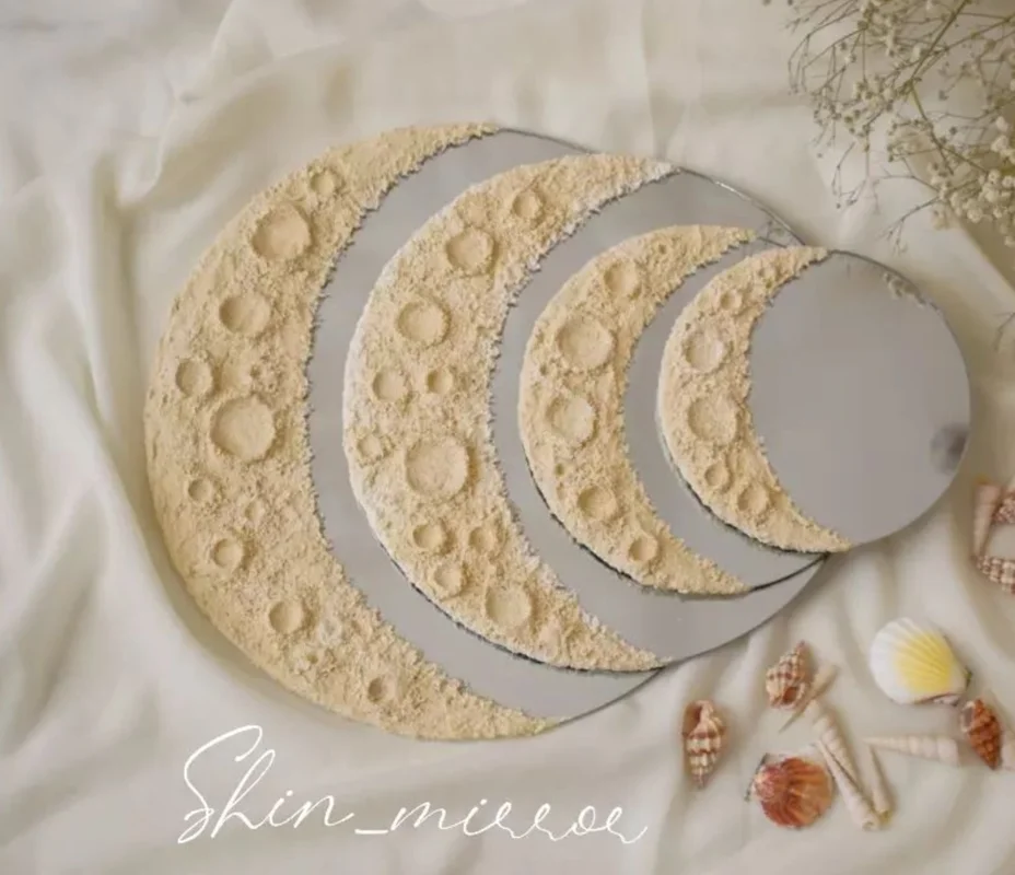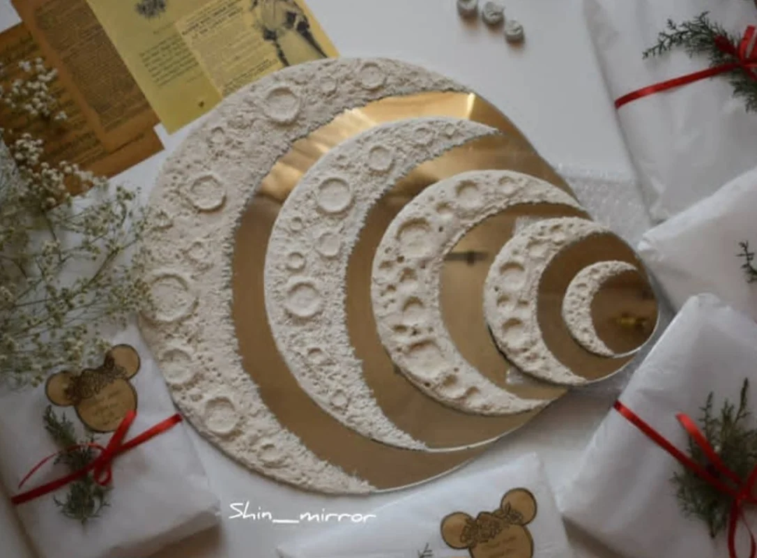 روی آیینه ماه خمیر تکسچر و رنگ نسکافه ای کار شده و با طراحی های مختلف شکل ماه درست شده